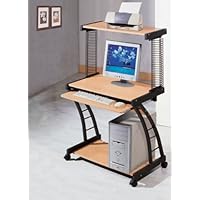 This computer desk, while modern and stylish, is designed for maximum comfort. Unlike cheaper desks that are made out of inexpensive plywood that bend and sag after a few months of use, our desks are made out of heavy-duty MDF board which is ultra strong and is certain to provide years of exceptional performance. This desk features heavy-duty double wheels that are hooded for your safety. Two of the wheels have locking mechanisms to keep your computer cart in place. The integrated wire CD racks will hold dozens of CD/DVD jewel cases. The desk has a slide-out keyboard tray that is ergonomically positioned to minimize wrist fatigue and make long periods of typing as comfortable as possible. The printer shelf on top of the desk will accommodate most inkjet printers, including wide-format photo quality printers. This desk was designed to get your complete PC unit into the smallest possible space. The overall footprint of the desk is 30.25 inches wide and 17.75 inches deep. The desk is 49.5 inches tall. Most CPUs will fit in the bottom CPU shelf. The surfaces are finished with a scuff resistant Maple color PVC material. And the bracing is a black powder coated metal. Assembly required. Computer not included.